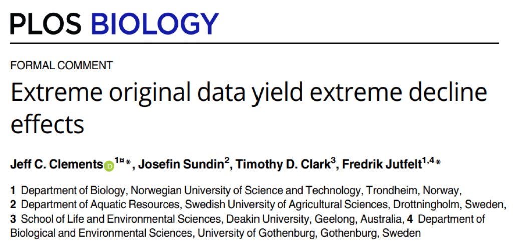 Back in February 2022, Jeff and colleagues (Josefin Sundin, Tim Clark, and Fredrik Jutfelt) published a paper describing an extreme “decline effect” in studies testing for ocean acidification effects on fish behaviour. Philip Munday recently reanalyzed those data, claiming that his “reanalysis shows there is not an extreme decline effect.”